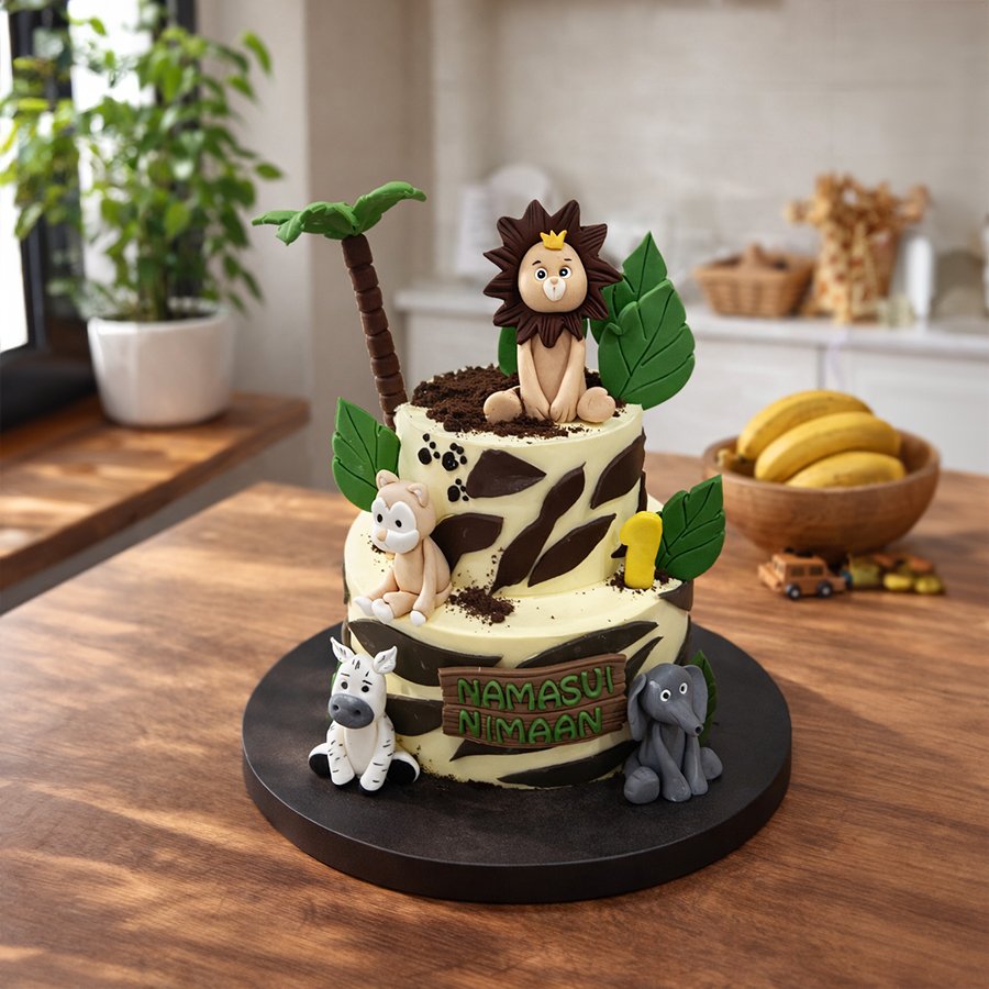 Take a walk on the wild side with this adorable jungle-themed cake. Decorated with handcrafted fondant animals—including a lion, zebra, and elephant—and finished with tropical leaves and a palm tree, it’s the ultimate centerpiece for a first birthday.