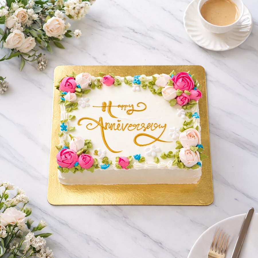 A stunning square-shaped vanilla cream cake adorned with handcrafted pink and peach buttercream roses. Featuring "Happy Anniversary" written in elegant gold calligraphy, this cake is a perfect centerpiece for celebrating milestones.
