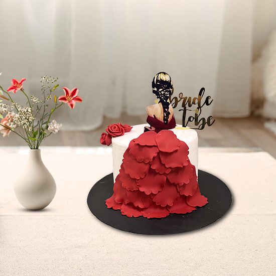 Make a statement with our show-stopping "Bride to Be" cake, featuring a beautiful bride dressed in a vibrant red gown. This exquisite dessert is perfect for the bride-to-be who dares to be different and wants to make a bold fashion statement.
